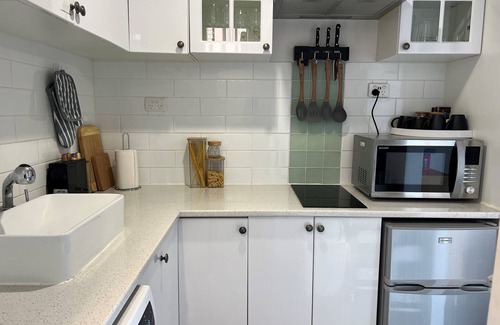 The kitchenette has 2 burner stove, microwave, Expresso Coffee Machine and a washing/dryer machine.