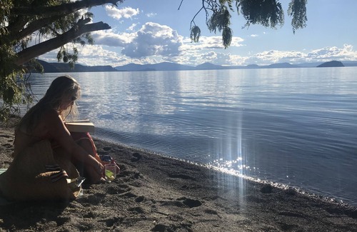 Hatepe is a quiet lakeside settlement populated with holiday homes and a growing number of permanent local residents. This sunny, warm Lockwood cottage with lovely lake views is nestled in native bush, 1 minute walk to the lake along the reserve. Great fly-fishing in the Hinemaia River and boat ramps for access to the lake. Close enough to National Park and the mountains while Taupo town and tourist facilities are only 20 mins by car. Bush walks close by. Astro turf tennis court available. Ideal for family holiday or for just a quiet break away from the bustle of family/business living. Comfortable living area-cozy in cooler months -warm woodburner with tons of firewood but very sunny during summer months. Delightful native bird population.Ideal accommodation when the snow arrives at Mt Ruapehu.