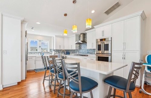 Top level: This astounding home is going to stand out from others! Beginning with the massive gourmet chef's kitchen (3 X the size of other houses this size!), appointed with everything you can imagine! All GE Monogram Commercial appliances include full-size double ovens, a French door top oven, a beautiful oversized island with bar stools, a microwave, and a prep sink. Equipped with every kitchen utensil, gadget, cooking, baking, eating, drinking, entertaining item you can think of, even a coffee bar station! The large dining table will host many family meals or be the perfect setting for evening games! Enjoy ocean views from the posh living room featuring a large screen, a frameTV so guests can view their pictures at the end of each day, a gas fireplace, and interior design like you've never seen! The top-level king master suite will be the perfect getaway offering a soaking tub, a beautiful tile shower, double vanity, closets with a sitting bench, and the ideal spot for morning coffee!