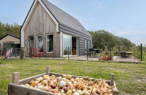 Discover the new luxurious and spacious holiday home located in peaceful Aagtekerke, surrounded by the quiet countryside. Open since February 2024, this charming summer house offers an idyllic escape. The holiday home is located near the owners' house. On their grounds, guests can enjoy a serene atmosphere by being surrounded by more than a hundred fruit trees, including blackberries, raspberries and native plants perfectly suited to Zeeland. A pool on the property collects rainwater, which is used for watering the gardens and greenhouses. Ten happy chickens roam freely in the yard. Overall, the wide view gives you a feeling of freedom and the surrounded terras offers a great spot to relax during summertime.