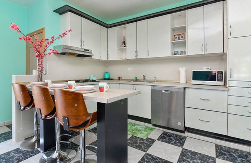 The apartment has two comfortable bedrooms, each with a king-size bed and plenty of closet space. The full bathroom includes two sinks, a shower, a relaxing tub, a bidet, and a toilet. There’s also a half bathroom conveniently located near the living area.