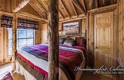 'Perfect couples Hideout' hence the name for Hideout Cabin! This cozy and comfortable one bedroom cabin features private outdoor hot tub, fully stocked kitchen, internet and gas fireplace. There is also a small gas fireplace in the master bedroom to keep you extra cozy on cool nights. Relax in the hot tub off the covered deck or sip coffee on the swing next to hot tub in the mornings. Hideout Cabin is our closest property to Ski Apache and backs up to the national forest with wooded scenery. Your friends can also stay at Charlie Cabin which is just around the corner. Cabin does not have washer, dryer or dishwasher. Hideout requires 4-wheel drive and possibly chains in winter months particularly during snow storms. Gravel drive to cabin is steep even in the best of weather.