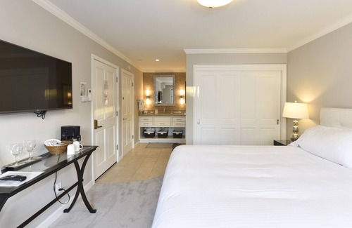 This newly renovated VIP premium Guest Suite is located on the first floor at 683 Cottages and is the perfect spot for a couple's getaway or a comfortable place for the business traveler to unwind. The room includes a mini-refrigerator and coffee maker and features a king bed, flat screen TV, bistro table with 2 chairs, iron and ironing board. The bathroom has a shower/tub and a hairdryer. (*Please note this room does not include a kitchen or living area, it is room and bathroom only). There is a private outdoor patio where you can enjoy your morning coffee or a glass of wine in the evening. It offers free Direct TV, local calls, and WiFi. You can walk to the nearby pool. No pets allowed.