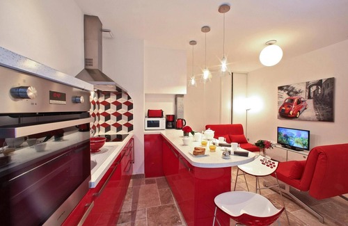 You will be charmed by the resolutely contemporary style of a fully equipped kitchen, designed and designed in Italy, combining the charm of raspberry colors and the modernity of the equipment.