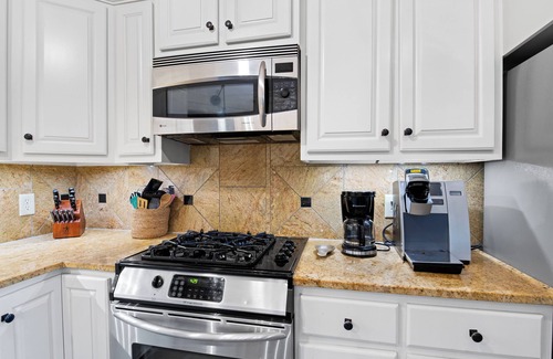 Upstairs, you’ll find two Guest Bedrooms, each outfitted with motorized adjustable Queen beds and Samsung TVs. These rooms share a full bathroom with a tub-shower combo, providing a comfortable and convenient space for guests. Please note these bedrooms have window a/c units while the rest of the home has central a/c.