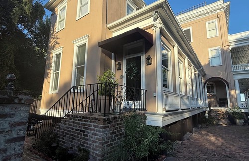This unique place boasts a style all to its own. Cone be a quest at the Historic Mevers Mansion, where we've been welcoming quest since 1896. The mansion originally served as the Battery House Inn until 1900. The stylish two-bedroom, two-and-a-half bathroom unit retains all the original charm while incorporating modern touched and updates throughout. During your stay, you’ll find a spacious apartment in the heart of Charleston, offering breathtaking views of the harbor. The two-story apartment boasts high-end furnishings in the family room, a 6-person table in the dining room, and a newly renovated kitchen with a washer and dryer. Upon ascending the stairs, you’ll discover two full suites. Each suite features a queen bed and dresser for storage, and the master bathroom includes a walk-in shower and a jacuzzi tub. Bath linens and bed sheets are provided. You’ll have shared access to the main floor veranda, just steps away, where you can enjoy the sweeping views of the harbor. If you prefer to dine at home, all dishes and cookware are provided in the kitchen. During the holidays, the main part of the house is decorated extensively, and you’ll be invited to a house tour one night of your stay. This tour will allow you to experience what people all over Charleston come to see. Please note that the apartment has steps to enter, and both bedrooms are located on the second floor. Additionally, we do not allow parties or music on the veranda, and the maximum number of guests allowed on the property is four.