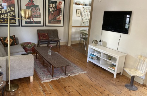 Kick back in this serene and stylish space in Leeds in the town of Catskill. Wide plank hardwood floors and an artist’s handpainted staircase add to the charm of this 1880s home. You’re less than two blocks from local bars, restaurants and shops, local swimming holes along the Catskill Creek and historic Leeds Bridge. An ideal home base for exploring the Catskills in all seasons: 15 mins to downtown Hudson and 30 mins to Woodstock, Kaaterskiil Falls or skiing at Hunter and Whindham mountains.