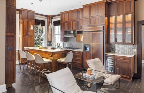The first floor includes a spacious, light-filled living room, with easy access to the well-appointed kitchen that includes space to relax with morning coffee in the adjacent sitting area. The gourmet kitchen is designed for the guest that loves to cook with deep sink, gas range, separate bar & beverage center, plenty of prep space, and features an oversized island that seats 4, plus abundant seating at the nearby dining table that seats 6 guests. Details that reflect the Gatsby-esque vibe include glittering, tiered crystal chandeliers, intricate moldings, beaded fixtures and mirrored accents on the walls. As you explore the first floor, you'll find a sumptuous powder room, built-in workspace, guest bedroom with FULL bed and easy access to a nearby full bathroom, plus a stack Washer/Dryer set.