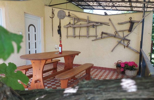 The holiday apartment is located in a single-family home and is furnished in a rustic style. The property is located in a holiday home area. Also due to its quiet and sunny location the domicile is popular. Available for shared use: terrace and garden furniture. 25 sqm terrace.LocationBalatonföldvár. The holiday apartement is located on a enclosed garden plot, bordered by a fence. The landlord does not live in the house or on the property. On the upper floor there is Holiday Flat BAL FOL 029 (4 persons). A total of 2 Holiday Flats on the estate. Access is via a side road (asphalted). Parking is available on the property. Specialair conditioning. Air conditioning is optionally available for 2000 Ft/night or 5 Euro/night.Facilities: internet access (WLAN). TV reception takes place via satellite. Dogsallowed, HUF 5000.00/pet per day. DistancesShopping 300 m, restaurant 50 m, town center 1200 m. Balatonföldvár: discotheque, bank each 1000 m. pharmacy 1200 m and railway station, doctor each 800 m. Railway line 800 m. Main road 1000 m. Children's playground 900 m. In summer: Balaton 300 m in Balatonföldvár (beach 300 m in Balatonföldvár featuring meadow and bathing plateaus). Balatonföldvár: fishing 1000 m, horse riding 2 km, water sports, boat rental each 300 m. dog beach, boat launch each 600 m. tennis 800 m. DivisionHoliday apartment, 1 floor, 2 rooms (including 2 bedrooms), 40 sqm, in total 5 beds (including 1 additional bed). RoomThe entrance to your holiday apartment leads over an external staircase directly into the kitchen-diner. Air conditioning is optionally available for 2000 Ft/night or 5 Euro/night. Bedroom with 2 single beds, TV and access to the terrace. Bedroom with 2 single beds and 1 additional bed on couch/sofa. Kitchen with gas stove, fridge (icebox), microwave and coffee machine. Bathroom with WC. Bathroom with shower and 1 washbasin. Terms of lease and pricesIncluded in the priceinternet access, parking place, electricity, gas, water, final cleaning, bed linen, Wireless Internet access. Side costs-Costs on the spot:/Obligatory:local tax by local tariff.On request:air conditioning 2000 Ft per object per day.Deposit:EUR 150,-/object