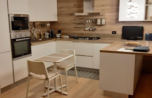 Inside, the flat features a spacious kitchen/living room with an extremely comfortable sofa bed, ideal for accommodating additional guests. The kitchen is fully equipped to cater for all your culinary needs: modern built-in appliances, including a double-door refrigerator, multifunctional oven, microwave, dishwasher, washing machine, 5-burner hob and extractor hood, as well as a coffee machine, toaster, pots, pans, crockery and everything you need to prepare and enjoy your meals. The master bedroom promises peaceful rest thanks to the comfortable bed with latex mattress, accompanied by a spacious wardrobe, chest of drawers, bedside tables and a shoe rack. The windowed bathroom guarantees functionality and comfort with a shower, toilet, bidet and ample furniture. In addition, the flat is equipped with all modern conveniences: Full HD LED TV, DVD player, air conditioning, independent heating, as well as an iron, drying rack, hairdryer, fresh bed linen, towels and personal hygiene and cleaning products.