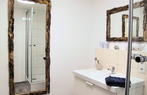 Through a separate entrance, you get into the apartment. The wardrobe offers space for jackets and shoes, from here you get into the main room, with the fully equipped kitchenette, small seat in the bay window, a comfortable bed (pull-out for 2 people, 1.60m wide and 2m long), an armchair ( foldable as couch, 0.90m pulp and 2m long), chest of drawers, wardrobe and TV. This is followed by the bathroom with shower. The toilet is in a separate room. On the small terrace in front of the house, you can enjoy the evening sun. Shops, café s, a bar and restaurants are located in the village (about 2km). In the apartment you have free Wi-Fi (Telekom hotspot) available.