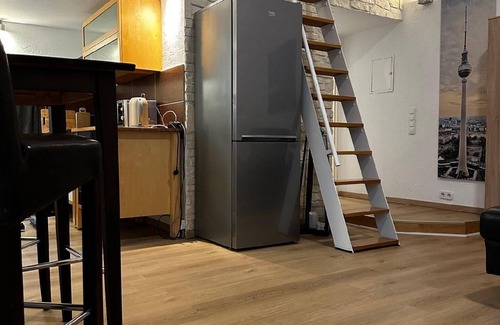 Elegant, luxurious gallery flat in the heart of Berlin The 45m² flat in the Wilmersdorf district impresses with its extravagant ambience. The integrated fitted kitchen offers everything you need for cooking, i.e. cooker with ceramic hob, sink, microwave, kettle, fridge with freezer compartment, toaster and coffee machine. The floor in the entire flat is made of wood laminate. The living room is furnished with a cosy sofa, a large flat-screen TV with DVD player and a wardrobe. The large sleeping gallery invites you to dream! Also with a television, of course! Despite the pleasantly quiet location next to a park, you are not far from the hustle and bustle of the city. The flat is located in a side street of the world-famous Kurfürstendamm with numerous shops and restaurants. The nearest underground station is Hohenzollernplatz, approx. 50 metres away. The Ku Damm underground station is 400 metres away. Can be reached by car: Messe approx. 5min, Kurfürstendamm approx. 1min, Potsdamer Platz approx. 5min, Alexanderplatz approx. 10min. For guests staying longer in Berlin, a cleaner can be provided. Pets allowed by arrangement. Please bring your own bed linen and towels. The gallery is to be used on your own responsibility. (I have to include this here because we have not barred the gallery because of the beautiful view) It is a really unique flat in a top location! Dogs YES / Cats unfortunately NO !W-LAN is available immediately !!!Short description 1Number of kitchens : 1 Living room 1 Other living room equipment : Flat screen TV, DVD, wardrobe, chest of drawers, designer sofa and table. Bedroom 1 Other bedroom equipment : A bed on the gallery 160 x 200 A couch in the living area ! or A self-inflatable bed 140 x 200 cm Surroundings Rental possibilities : Boat rental, bicycle rental Sports facilities in the area : Basketball, football field, ice skating, climbing, mountain biking, cycling tours, indoor riding arena, riding arena / riding possibilities, rowing, sailing, squash, surfing, tennis