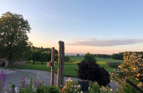 A gem for nature lovers, city travellers, sea lovers, culture enthusiasts, mountain lovers, gardeners, terrace loungers, hikers, cyclists, birdwatchers, design lovers.............A holiday home for people who want to unwind in a beautiful ambience. The holiday flat has 4 differently designed bedrooms. 2 double rooms, 1 twin room (bunk beds) and 1 single room. So it offers space for 1-7 people. There are 2 modern bathrooms with underfloor heating. In the cosy living room, with a fantastic view as far as Lake Constance, there is a Swedish stove for cosy evenings in the house. The modern kitchen invites you to cook. New perspectives open up everywhere....inside and out. Every corner of the house has been lovingly designed. High-quality pigment colours and finely oiled wooden floors underline the beautiful design and create a special sense of well-being. There is no television to spoil the special atmosphere of the house. Instead, there is free WLAN. A small library invites you to rediscover the written word. There is a garden with fruit trees, sun loungers and a barbecue as well as a furnished south-west-facing terrace for sundowners. Outside, the view is sometimes of the mountains and sometimes of nearby Lake Constance. A lovely spot in the garden or the crackling stove will tempt you to simply let your mind wander. Take a deep breath in nature or let yourself be inspired by Constance, just 7 kilometres away. A very private retreat away from home for a short or longer break.