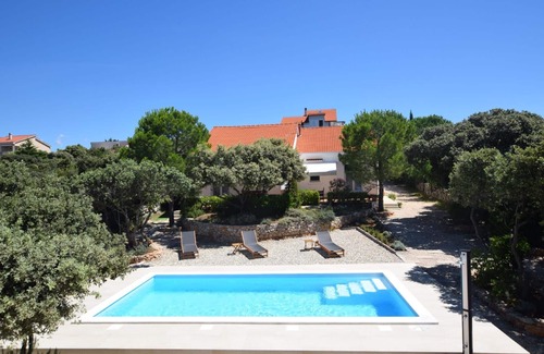 This spacious house apartment with swimming pool and garden for use is located on the island Pag. The terrace with outdoor furniture and garden grill is a wonderful place to sit. Your home offers complete comfort, including kitchen with dishwasher, air conditioning, washing machine, free wifi, garden furniture, loungers, comfortable bedrooms and bathroom. Accommodation is 350 distant from the beach. Within the distance of 0.4 km you will find beach, grocery store, restaurants and bars.
