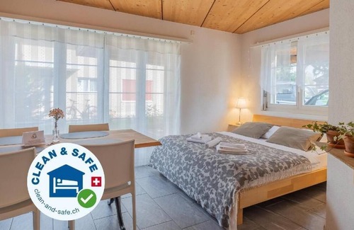 Calm. An ideal place to relax. Alone or as a couple. The kitchen is well equipped with everything you could need during a vacation. You can relax on the wonderfully comfortable memory foam mattresses (Tempur) and in the evening sun on the terrace. The apartment was partially renovated in 2018 and we installed a beautiful slab floor. There are various bicycles right outside the front door, which my guests can use for free at any time. I live next door and like to take time for my guests. Please call or text me at any time. The apartment is located in a quiet residential area. It can be reached on foot in less than 15 minutes from the train station. A bus stop is only a 4-5 minute walk away. My favorite restaurants for Italian and traditional Swiss cuisine are just a few minutes' walk away. You can reach the Coop supermarket from the apartment in 5 minutes.