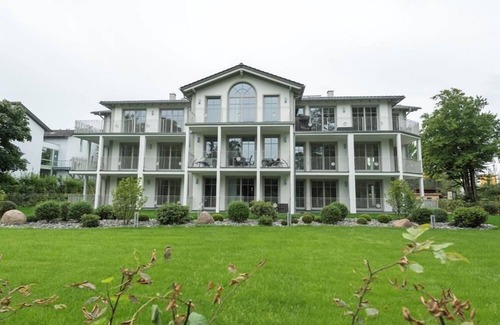 Our newly built Villa Pauline (August 2016) is situated in an exposed and idyllic location directly on the forest promenade on the high shore in the Baltic seaside resort of Göhren. The spacious 3-room holiday flat is perfect for families and individual travellers. The exclusive 3-room holiday flat is modern and furnished to a high standard and has a large balcony and a small balcony to enjoy the good Baltic Sea air and sunshine on Rügen at any time. The fine sandy north beach with the amber promenade is about 400 metres away and the natural beach (south beach) can be reached comfortably in about 10 minutes on foot or in even less time by bike. Incidentally, you can park your bike directly in your own bike shed at the house. Do you also like to be online on holiday? You will find free Wi-Fi in the holiday flat. Holiday flat in the Villa Pauline in Göhren on Rügen 3-room holiday flat with 2 balconies, 2nd floor Entire flat with large windows at ground level Fantastic view of the forest promenade on the high shore Distance to the north beach approx. 400 metres and south beach approx. 10 minutes' walk to the town centre Free Wi-Fi in the flat Barrier-free Sauna in the flat Lift in the house with fireplace 2 free parking spaces available directly at the house Bicycle storage available Non-smoking flat! Pets not permitted 3-room flat no. 8 with 2 balconies, 2nd floor.