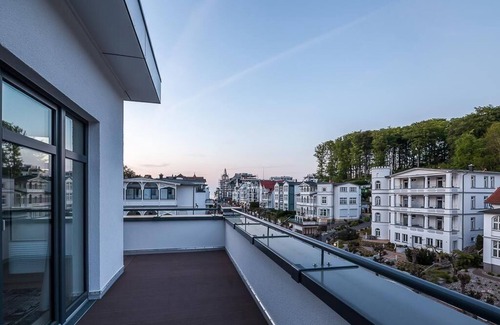 On the large, wrap-around balcony there is, among other things, an elegant lounge seating area, from here there is a great view over Wilhelmstrasse to the sea, which is approx. 300 metres away, as well as the surrounding forests and villas.