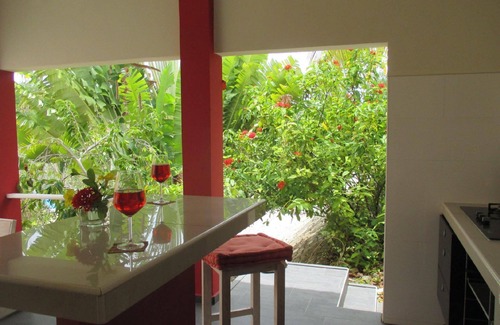 The tasteful "M" (Middle) flats on the extensive grounds of over 6000 square metres are equipped with modern amenities to ensure your comfort. They are perfect for 2 people. Each flat is equipped with air conditioning, solar water heating, fans and free internet access. Amenities such as allergy-neutral mattresses in the bedrooms, windows with fly screens for a mosquito-free breeze and spacious bathrooms contribute to a pleasant stay. A highlight is the fully equipped outdoor kitchen on the covered terrace, complete with dining bar and comfortable seating area for cosy evenings.