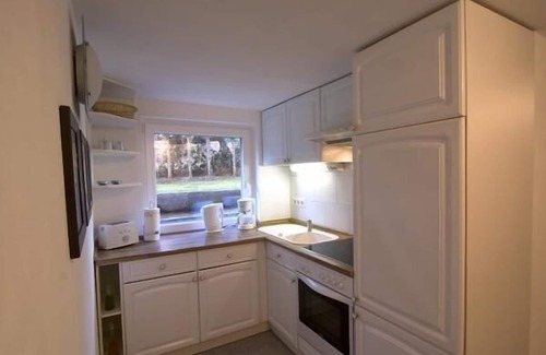 Guest apartment in Stahnsdorf (between Berlin and Potsdam), quiet area, near the forest; yet only 5 minutes driveway to the A115 (compound Potsdam - Berlin). The apartment has a direct bus to Potsdam's main station. The apartment is located in the basement of a newly built semi-detached house with separate entrance and is 47m² in size. The sleeping area has two single beds. In the living room a sofa bed (140x180cm) is present. Furthermore, the living room has a TV connection (flat screen). The apartment has a covered terrace with scenic forest views. Barbecue available. The apartment is fully equipped with underfloor heating. The kitchen is complete with an oven, set oven with four hobs and a refrigerator. The bathroom has a bath with shower attachment. Information: This apartment is not suitable for people over 2.00 m.
