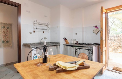 The cosy holiday apartment Ulivi in the beautiful Villa Belvedere is located in the countryside near Bari Sardo, yet only a short walk from the beach. The 40m² apartment consists of a living room, a well-equipped kitchen, a bedroom as well as one bathroom and can therefore accommodate 2 people. Additional amenities include a shared washing machine, A/C, Wi-Fi, organic soaps and fans.