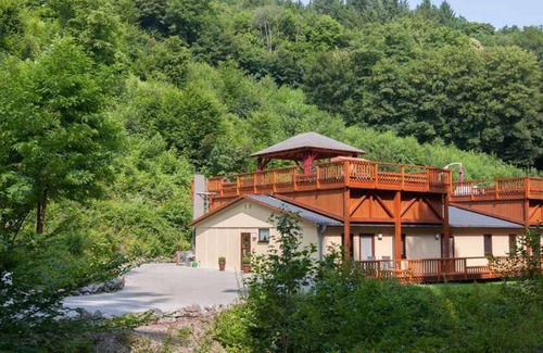 Your vacation object: The Holiday apartment is located on a garden property with meadow, bushes and trees. The lift is a pleasant relief not only on arrival and departure. The house has a total of 4 apartments. The roadside fencing of the property contributes to the quiet and safe environment. The owner lives in a separate building on the same estate. The facilities are at your disposal for common use. Relax outdoor at the terrace with pavilon, parasol, sunlounger and garden furniture. The playground makes children's hearts beat faster. Barbecue possibilities are available. The campfire place promises romantic evenings. Immediately on the property there is access to various hiking and mountain biking trails. In summer you have a pleasant and healthy possibility of cooling down by the stream. Your children will enjoy the opportunity to splash in the water. Since about 1 km above our property flows a warm spring into the stream, you can use the Kneipp facility even in the transitional period, without suffering from frostbite. The spa includes a whirlpool a whirlpool. Your fitness, you can keep busy with table football, table football, table tennis and table tennis. Our barbecue hut is under a huge chestnut tree. You can grill here by the campfire (firewood is available and will be charged according to consumption) or use the existing gas grill. Benches, tables and stools in the barbecue hut are handmade from solid oak. You can have your drinks cold in the stream or take the cooler from the common room into the barbecue hut. The barbecue hut is equipped with sockets and light. With the help of wooden lamella walls you can keep drafts when necessary. Your holiday apartment: Your holiday apartment offers 1 floor, 2 rooms (from which 1 bedroom), is 98 sqm and can accommodate up to 5 persons. On colder days your holiday apartment can be heated with central heating (fuel oil). Ecologically heated by combined heat and power. Smoking is not permitted inside the rooms. The entrance is on the ground floor, ground level and wheelchair accessible and leads directly in the living room with wardrobe. The rooms are divided as follows: Living room / bedroom as intersecting room, 38 sqm and with 1 single bed and 2 additional beds at couch/sofa, lounge, dinette, TV and DVD. The dinette offers space for 5 persons. You have access to the terrace. Bedroom 18 sqm and with 1 double bed and TV. You have access to the covered balcony. Cooking nook in the living room / bedroom as intersecting room and with dishwasher, electric cooker (ceramic stove top, 4 plates), oven, refrigerator (freezer), coffee machine, toaster, electric water boiler and washing machine. Bathroom 5 sqm and with bathtub, jacuzzi, 1 washbasin, WC and hairdryer. Bathroom 5 sqm and with shower, 1 washbasin, WC and Disability Access. In addition, your holiday apartment is equipped with WLAN- internet access, telephone and washing machine. TV or radio channel can be received per satellite. Satellite TV (Astra 19.2 ° East + Astra 23.5 ° East + Eutelsat Hotbird 13 ° East + Astra & Eurobird 28.5 ° East) in the living room, in the bedroom and in the additional living / bedroom (two with DVD Players) Pets: erlaubt, EUR 20.00/Tier und Aufenthalt.