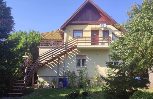 The holiday apartment is located in a single-family home, was renovated in 2011 and is furnished in a modern style. The property is located in a residential area. Also due to its quiet and sunny location the domicile is popular. Available for use: sunbathing lawn, parasol, barbecue facilities, terrace and garden furniture.LocationBalatonfüred. The holiday apartement is located on a 400 sqm enclosed garden plot with meadow, flowers, shrubs and trees, bordered by a fence. The landlord lives permanently in the house, but uses a seperate entrance. Access is via a side road (asphalted). Parking (for 2 cars) is available on the property. Garage for 1 car. Specialair conditioning.Facilities: internet access (WLAN) and washing machine. TV reception takes place via electric wire. Dogsnot allowed. OdległościShopping 100 m, restaurant 100 m, town center 300 m. In summer: Balaton 800 m in Balatonfüred. Aqua Park 2 km. Waterfront 800 m. Podział wnętrzaHoliday apartment, 1 floor, 5 rooms (including 4 bedrooms), 100 sqm, in total 8 beds. PomieszczeniaThe entrance to your holiday apartment is located upstairs and leads over an external staircase directly into the living room. Living room with sitting area, TV, dining area (8 seats) and access to the balcony (16 sqm, garden furniture, 2 tables, 8 chairs, parasol). 4 bedrooms each with 1 double bed. Kitchenette with electric stove (ceramic hob), oven, extractor hood, dishwasher, fridge (icebox), microwave, coffee machine, toaster, electric kettle and washing machine. 2 bathrooms each with shower, 1 washbasin and WC. Warunki i cenyW cenie już zawarteinternet access, air conditioning, parking place, electricity, gas, water, final cleaning, bed linen, sunloungers, Wireless Internet access. Koszty dodatkowe-Dodatkowo(Zapłata na konto)/local tax.Kaucja:EUR 50,-/object.