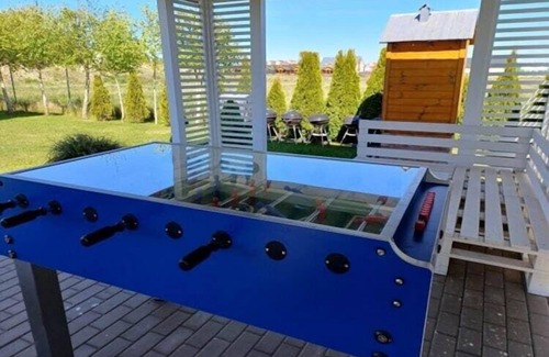 Layout: Ground floor: (open kitchen(electric kettle, toaster, cooker(2 ring stoves, electric), microwave, fridge-freezer), Living/diningroom(double sofa bed, TV(flatscreen), dining table), bedroom(single bed, single bed), bathroom(shower, washbasin, toilet)) Barbecue center, Internet access, Parking, Shop, Bike rental, Table tennis, Play area, terrace(roofed), garden(shared with other guests, fenced), garden furniture, trampoline(shared with other guests), slide(shared with other guests), bicycles available, high chair, Garden shed, Swing set, baby crib(free)
