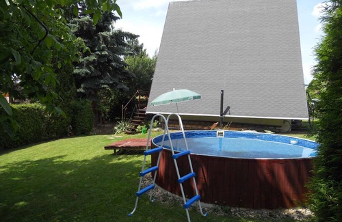 The detached holiday home is furnished in a functional style. The property is located in a holiday home settlement. Also due to its quiet and sunny location at the edge of the forest the domicile is popular. Available for your exclusive use: parasol, sun lounger, children's playground, swing, garden shower, barbecue facilities, terrace, garden furniture and campfire site. Dogs are only allowed on the ground floor of the house and are not allowed in the bedrooms or on the beds. In the case of furniture destruction by dogs, the costs must be borne by tenants. Please bring your own dog bed or dog basket. Badminton.LocationKatlov, 480 m above sea level. The holiday home is located on a 300 sqm enclosed garden plot with meadow, bordered by a fence. The landlord does not live in the house or on the property. Cottage area Katlov. The small house is located in a quiet recreation area on a pond and a tennis court. Access is via a side road (asphalted). Parking is available in a garage and on the property. Specialelectric heating.Facilities: children's toys, internet access (WLAN) and washing machine. TV reception takes place via satellite. PoolAll pools are available for exclusive use. Outdoor pool (usable from early June to mid September, diameter 2,5 m, depth 0.9 m). Pool from June to mid September, depending on weather. Leisure6 bicycles and table tennis. Dogsallowed, EUR 10.00/pet per day. DistancesShopping 1000 m, restaurant 1000 m, town center 18 km. sauna in Katlov 20 m. doctor, pharmacy, bank each 18 km in Kutna Hora. Sightseeing flights in Zbraslavice 4 km. City Zruc nad Sazavou 15 km. Kutna Hora with historical sights and great summer toboggan run 18 km. Prague 75 km. Toboggan run, those wines Gallery, Jezuits College locally. Zbraslavice with rides 4 km. Bohdanec with lookout tower, recreational activities for children and distillery 8 km. In summer: pond Katlov 50 m in Katlov. horse riding in 22 km. Katlov: tennis 20 m and fishing 50 m. Recreation area with tennis court, volleyball court, table tennis 20 m. Use of tennis 20 m from the property is free of charge. Klimeska outdoor swimming pool with a large toboggan 18 km. DivisionHoliday home, 2 floors, 3 rooms (including 2 bedrooms), 65 sqm, in total 5 beds. RoomThe entrance to your holiday home is located on the ground floor and leads over an external staircase.Ground floor: Living room with sitting area, TV, fireplace and dining area (5 seats). Kitchenette with electric stove (2 plates), oven, fridge, microwave, coffee machine and electric kettle. Bathroom with shower and WC. Top floor: Bedroom with 1 double bed. Bedroom with 1 double bed and 1 single bed. Terms of lease and pricesIncluded in the priceOutdoor pool, internet access, bicycle, garage, parking place, water, pool, table tennis, sunloungers, Wireless Internet access. Side costs-Additionally(Payable when booking)/local tax.Costs on the spot:/Obligatory:electricity 0,50 € per kilowatt hour based on usage. final cleaning if pets 40 € per object per stay. final cleaning (if not performed by the tenant) 70 € per object per stay. dish towels to bring along. bed linen to bring along. hand towels to bring along.On request:chimney wood 5 € per package based on usage.Deposit:EUR 400,-/object.