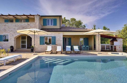 The detached holiday home built in 2013 and is furnished in a typical country style. Available for your exclusive use: children's playground, swing, garden shower, barbecue facilities and garden furniture.LocationŽminj, district Folići. The holiday home is located on a 966 sqm plot. The landlord does not live in the house or on the property. Specialair conditioning.Facilities: internet access (WLAN), iron and washing machine. TV reception takes place via satellite. PoolAll pools are available for exclusive use. Outdoor pool (usable from mid May to end of September, 5 m x 9 m, depth 1,4 m). WellnessSauna and whirlpool. Dogsallowed, EUR 14.00/pet per day. DistancesShopping 3 km, restaurant 3 km, town center 3 km. airport in Pazin 25 km. railway station in Pula 15 km. In summer: Adriatic Sea 25 km in Rebici (beach 25 km in Rebici featuring gravel and stones). DivisionHoliday home, 2 floors, 6 rooms (including 5 bedrooms), 278 sqm, in total 12 beds (including 2 additional beds). Room Living room with 2 additional beds on couch/sofa, TV, CD player, dining area and access to the balcony access to the terrace (covered, garden furniture). Bedroom with 1 double bed, TV and access to the balcony. 4 bedrooms each with 1 double bed and TV. Cooking nook in the living room with dining area, gas stove, electric stove, oven, dishwasher, fridge (30 l, icebox), coffee machine, toaster and electric kettle. Bathroom with bathtub and WC. 4 bathrooms each with shower and WC. Terms of lease and pricesIncluded in the pricedish towels (03.11.24-01.01.28), internet access (03.11.24-01.01.28), air conditioning (03.11.24-01.01.28), electricity (03.11.24-01.01.28), gas (03.11.24-01.01.28), water (03.11.24-01.01.28), heating (03.11.24-01.01.28), final cleaning (03.11.24-01.01.28), bed linen (03.11.24-01.01.28), hand towels (03.11.24-01.01.28), bathing towels (03.11.24-01.01.28). Side costs-Additionally(Payable when booking)/local tax.Costs on the spot:/Obligatory:registration fee 5 € per person per stay (03.11.24-01.01.28).Deposit:EUR 300,-/object.