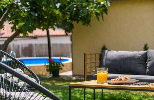 The detached holiday home built in 1987, was renovated in 2009 and is furnished in a modern and typical country style. The property is located in a residential area. Also due to the view over a panorama from the property and its quiet and sunny location the domicile is popular. This property is a family-friendly accomodation. Available for your exclusive use: sunbathing lawn, parasol, sun lounger, garden shower, barbecue facilities, terrace, garden furniture and courtyard.LocationBarban, district Puntera, 254 m above sea level. The holiday home is located on a 1080 sqm enclosed garden plot with meadow and trees, bordered by a fence and a hedce. The landlord does not live in the house or on the property. Access is directly from the main road (asphalted, length 15 m). Parking (for 2 cars) is available on the property. Specialair conditioning, central heating (oil).Facilities: baby cot, high chair, internet access (WLAN), iron and washing machine. TV reception takes place via satellite. PoolAll pools are available for exclusive use. Outdoor pool (usable from early May to end of October, diameter 4 m, depth 1,2 m). Leisure2 bicycles. Dogsnot allowed. DistancesShopping 1500 m, restaurant 300 m, town center 1500 m. doctor, pharmacy, bank each 1500 m in Barban. Pula: airport 20 km and railway station, discotheque, cinema each 25 km. In summer: Adriatic Sea 15 km in Rakalj (beach 15 km in Rakalj featuring gravel, stones and rocks). tennis in 16 km. golf in Brijuni 30 km. diving in Krnica 15 km. horse riding in Manjadvorci 5 km. water sports, boat rental each 20 km in Rabac. DivisionHoliday home, 1 floor, 5 rooms (including 4 bedrooms), 220 sqm, in total 10 beds (including 2 additional beds). RoomThe entrance to your holiday home is located on the ground floor and leads directly into the vestibule with wardrobe. Living room (30 sqm) with 2 additional beds on double sofa bed, sitting area, TV and access to the terrace. Bedroom (20 sqm) with 2 single beds. Bedroom (20 sqm) with 2 single beds and access to the balcony. Bedroom (20 sqm) with 1 bunk bed. Bedroom (20 sqm) with 1 double bed and access to the balcony. Kitchen (30 sqm) with dining area (8 seats), gas stove (4 flames), oven, extractor hood, dishwasher, fridge (70 l, icebox), microwave, coffee machine, toaster and electric kettle. Hallway in the hallway (14 sqm). Wind trap (25 sqm) with sitting area. Bathroom (12 sqm) with washing machine, whirlpool, 2 washbasins, WC, bidet, hairdryer and window. Bathroom (9 sqm) with shower, 1 washbasin, WC, bidet and window. Terms of lease and pricesIncluded in the priceOutdoor pool, babycot, air conditioning, parking place, electricity, gas, water, final cleaning, bed linen, hand towels, sunloungers, Wireless Internet access. Side costs-Additionally(Payable when booking)/local tax.Deposit:EUR 200,-/object.