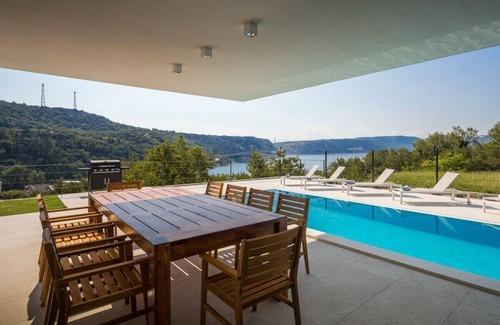 The dreamlike Villa Adria Blue was built in 2020 and is furnished with great charm and attention to detail. A simply elegant, extremely comfortable 314 m² house for a maximum of twelve people awaits you. You can enjoy the fabulous sea view all day long while soaking up the Mediterranean sun on one of the comfortable sun loungers by the 32 m² pool. Here you are sure to spend unforgettable barbecues with family and friends, while the children play volleyball, football or badminton on the green area behind the house. Each room has its own bathroom, a balcony with a view of the bay and a TV. The entire house has underfloor heating and is air-conditioned throughout, making it cosy all year round. On the ground floor there is a huge light-flooded living and dining area, as well as a fully equipped kitchen.