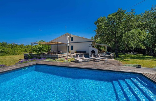 A beautiful holiday house with a swimming pool and a large yard for a maximum of 10 persons,. It is located in small place Garica on the island of Krk. The house has two covered terraces near the pool, large, fully equipped kitchen with dining room and living room, four air-conditioned bedrooms and three bathrooms. Surrounded by nature, the house is ideal for holidays with family and friends. Your pets are welcome!