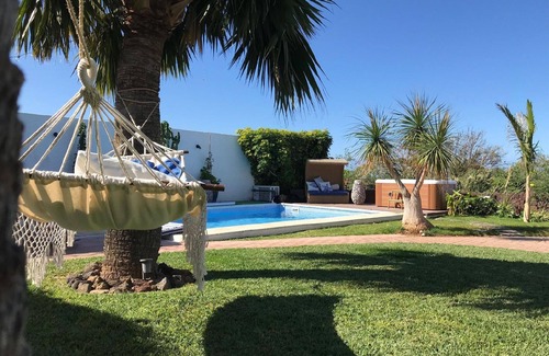 The 400 square metre garden has a private swimming pool. Next to it up to six sunbeds and sunshades with pool towels. The Patio is a room open to the garden, prepared as a dining room for six people and with an inside toilet. The Mirador del Atlántico is located in a corner of the garden and overlooks the ocean and Mount Teide. It has a table and six chairs. The barbecue is mobile and can be used at various points in the garden. The jacuzzi is located next to the pool.