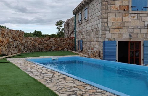 This quietly situated holiday house, a stone house from the 19th century, welcomes you in the little village of Dabovi Stani on the island of Pag, 8km from the centre of Novalja. It is 400 metres from the main street and the same distance from a typical Mediterranean bay with a beach, a five-minute walk away through nature.