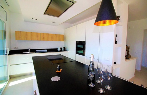 Holiday house of two floors, very well equipped (Bedrooms floor below). With magnificent panoramic views over the bay of Canyelles.