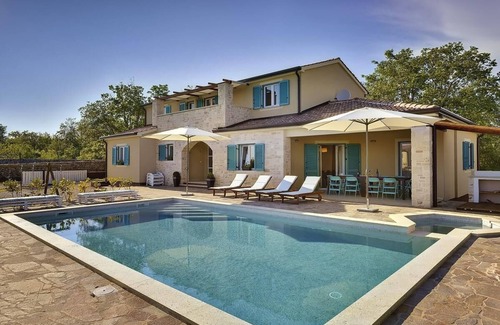 The detached Villa Martha has a spacious yard with a children's playground and a large swimming pool with Jacuzzi. Villa Martha, located in central Istria, in Folići, is surrounded by greenery and completely fenced to provide maximum privacy for its guests. The interior is modern and tastefully decorated, and the kitchen and living room are spacious and well-connected. Two air-conditioned bedrooms with double beds and SAT-TV are located on the ground floor, while three other bedrooms, also air-conditioned, with double beds and SAT-TV, are located on the first floor and each with a private bathroom. This irresistible Villa Martha in Folići is the perfect place for a relaxing holiday, because You can use a sauna, and for those looking for recreation, exercise equipment and table football are available.
