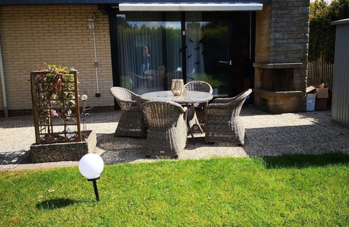 The house has a large furnished terrace with chairs, a table, a beach chair and a lounger. A charcoal barbecue is also available. The garden is almost completely fenced in or enclosed by a thick hedge.