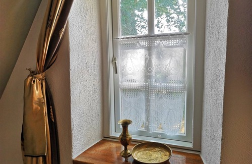 Studio on the first floor of the listed old pastorate from 1750. Former travel room of the bishop! "Bishop's travel room" originally had two alcove chambers in former times. Behind the blue gull-wing doors that have been preserved are now a shower room with WC and a small fitted kitchen. There is also a walk-in closet or Storeroom. The bed has a size of 160 x 200 cm. Remains of a historic wall design are preserved.