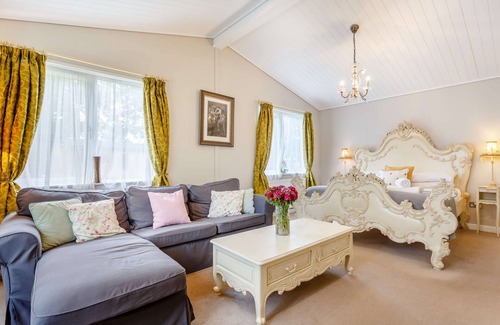 Shabby chic and spacious luxury retreat. Sumptuous king size antique style bed and widescreen TV/DVD. Separate modern fully equipped kitchen. Extravagant panelled bathroom with freestanding bath, sauna and separate shower and French doors leading to sunken canopy covered outdoor hot tub with magical twinkling star lights. No pets.
