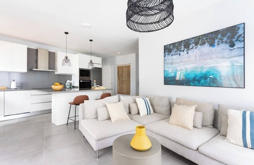 It is ideal for families, couples and business trips, as it has capacity for 4 people, with three beautiful bedrooms, two large bathrooms, one of them en suite in the master bedroom. With fully equipped open concept kitchen that connects to the spacious living room with large windows overlooking the sea. From the terrace you can see the beach and feel the breeze of the waves. With fiber Wifi Internet fiber designed for teleworking and all the necessary services around. With all the comforts, it has air conditioning, Smart TV and communal pool in the complex.