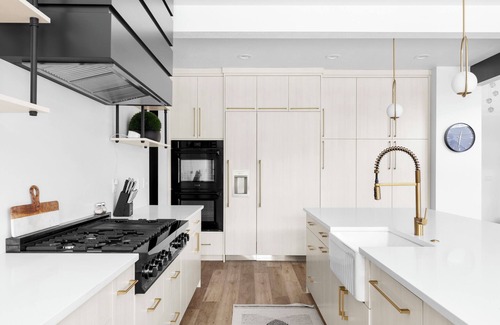 The kitchen has seating for 20 with a massive island, high end 8 burner stove top, double ovens, and an oversized fridge and freezer that makes this the perfect place for entertaining and large gatherings.