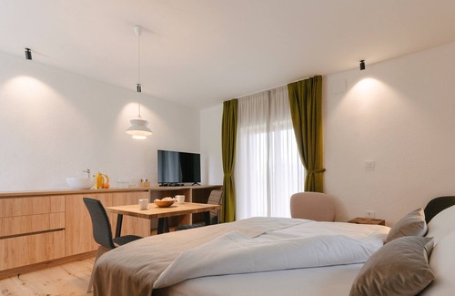 Studio Superior is one of three apartments on the ground floor of our completely renovated 18th century farm house. It is arranged and furnished in such a way that it offers guests complete comfort to relax and, due to the way it was built in the past also peace. On 35 square meters there is a sleeping area with a separate bathroom, equipped with a shower, sink, toilet and bidet. The room also has a table and a water heater for making instant coffee or tea as desired. The bed, like the others in the hotel, is a large double bed with a premium mattress and made to order bed linen that will provide a well deserved and relaxed rest.