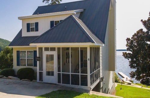 Covered deck with outdoor dining furniture and rocking chairs facing the lake; covered screened-in-porch facing the pool; lower-level patio with dining furniture with direct beach and lake access; private boat dock with Adirondack chairs and table extending into the lake