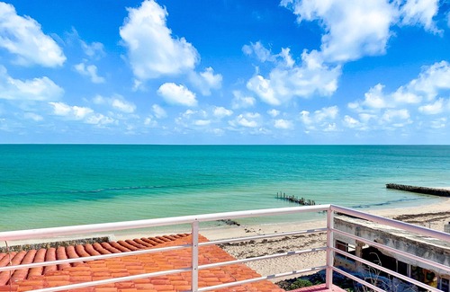 Directly on the beach, the House of Arches is the perfect spot for your Yucatan vacation. After enjoying the sparkling emerald green waters of the sea, take a swim in the patio pool next to the outdoor kitchen and dining area. Enjoy complimentary wifi and flat-screen television. Indoor and outdoor kitchen. A beautiful Florida room overlooking the garden for escaping occasional strong afternoon breezes. Two primary King bedrooms each with its bathroom complete this Spanish-style home.
