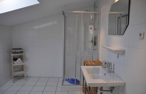 Apartment 5 is tastefully furnished with every comfort, such as well equipped kitchenette (microwave, ceramic hob,) open to the living area. Bedroom with double bed, shower / wc. Lovingly furnished living room with dining area, sofa (as extra bed for 2 more people possible), TV, radio. This apartment is characterized by special brightness (windows in the roof slopes). Bicycle storage and parking are available.