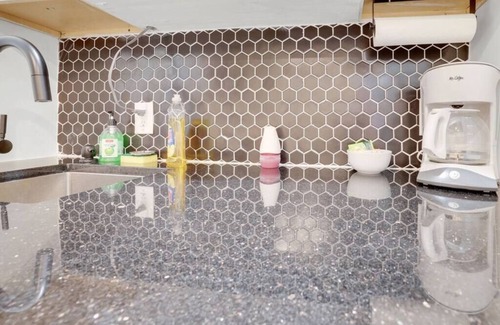 This is beautiful studio apartment that blends old brick with modern surfaces. Enjoy the convenience of parking just steps from your door, and your entire suite on ground level. Our space is a queen bed, couch , TV, Kitchenette, and full bathroom. The kitchenette has a fridge, sink, chair and work/space, coffee maker, microwave, and basic dish set. No stove here! Enjoy a movie from bed or the couch! Our bathroom is completed with a luxurious walk-in shower with glass doors and subway tile.