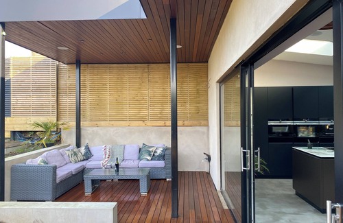 This home brings a little of bit of LA/Palm Springs architectural style to Hove. A stunning recently completed extension provides the perfect social pad for your friends and family to enjoy evenings together by the pool or the fireside. Its five large double rooms offer plenty or room for everybody to spread out. The property is going through its final stages of renovation, so although parts are a little tired, the social spaces and garden are magnificent and make up for that. Next to hove park with a gorgeous coffee shop for a morning stroll, or just a 25 min walk to the beach (or 5 min car ride) this is the perfect house to explore Brighton, Hove and the stunning South Downs. Please note we have two beautiful resident female cats in the house, Harley and Betty. They are very friendly, and have an automatic feeder and cat flap so they don't require any assistance, but we do ask for people who book to be animal lovers.'
