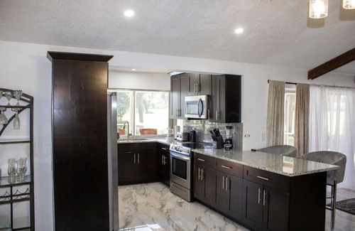 All new floors, bathrooms and kitchen so be the first to experience this home full of great entertaining spaces. Sleeps 6 but can add up to 8 with both living rooms accommodating blow up mattresses . The Yard is sunny all day and sun sets along the back. The Lanai spaces provide great shade for reading, relaxing and children at play!
