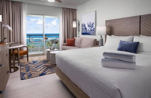 Magnificent ocean, garden or pool views welcome you to a residential-style lock-off condominium. The two-bedroom lock-off features a one-bedroom condo that is connected to our spacious studio condo via the entryway foyer. The one-bedroom includes a king-size Hyatt Grand bed and adjoining bath with walk-in shower. The studio portion includes one king-size Hyatt Grand bed, one queen size sofa bed and full bath. Amenities include full kitchen, dining area, furnished balcony, washer and dryer, and living area with sofa bed, flat-screen TV with Blu-ray™ player and wireless high-speed Internet.