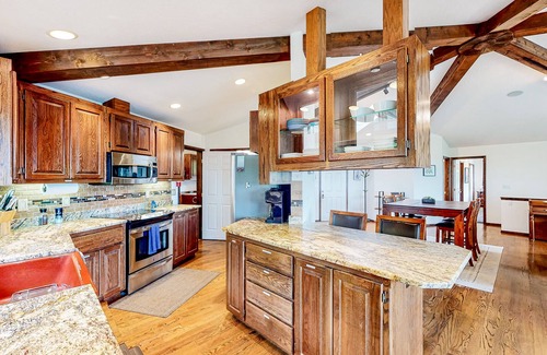Inside your home away from home, the hexagonal main room is drenched in sunlight from the home's many windows. The oversized sofa offers a serene space to kick back and warm up in front of the heat of the wood stove while watching your favorite TV shows and movies. The full kitchen gleams with its ample meal prep space and suite of stainless steel appliances. Dining as a family can be cherished at one of the indoor dining tables or alfresco on the deck.